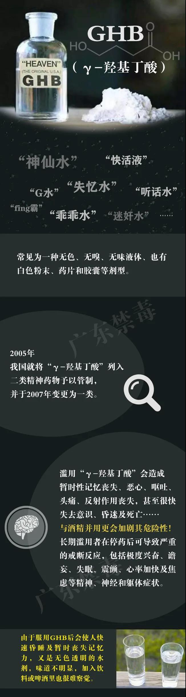 滥用“γ-羟基丁酸”会造成暂时性记忆丧失、恶心、呕吐、头痛、反射作用丧失,严重的会导致失去意识、昏迷及死亡。该饮料属于新型毒品,我国已将“γ-羟基丁酸”列入一类精神药物予以管制。