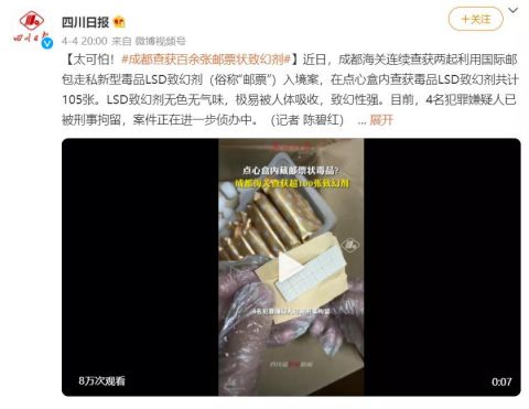 “邮票”学名麦角二乙酰胺(LSD),属于半人工致幻剂,是迄今发现药效最强烈的精神药品之一。这种毒品毒性极强,一般是摇头丸的3倍,几微克就足以让人产生幻觉。据吸食者称: “