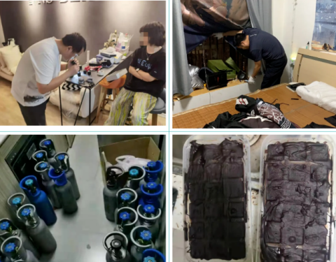 随后勘查组对嫌疑人的住所进行勘查,分别查获:4-ACO-DMT巧克力毒品疑似物170克、4-ACO-DMT半成巧克力毒品疑似物491克、4-ACO-DMT胶囊毒品疑似物11克、大麻烟丝毒品疑似物3038克、绿色卡痛粉毒品疑似物940克。同时,现场查扣成品大麻电子烟269支、半成品大麻电子烟1467支,大麻电子烟配料14545克,笑气43瓶(430升),毒资人民币34100元,其他制作工具若干。目前,该案还在进一步侦办中。