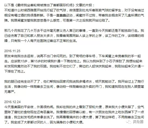 多年内从未碰过烟酒的她原本认为自己是个极有克制力的人,但最终却因一个个气球和小钢瓶而导致双腿无力瘫痪,坐着轮椅出现在北京首都国际机场。