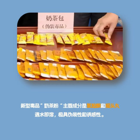 “奶茶粉”与其他液体混合时,气味以及味道并不会改变。此类毒品的外形与真正的奶茶包极度相似,遇水即溶,服用后极度亢奋,容易上瘾。