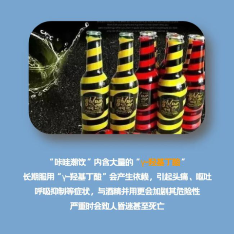 “咔哇潮饮”中含有国家管制的第一类精神药品“γ-羟基丁酸”。滥用“γ-羟基丁酸”会造成暂时性记忆丧失、恶心、呕吐、头痛、反射作用丧失,严重的会导致失去意识、昏迷及死亡。