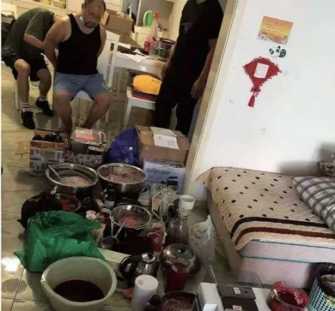 制毒窝点这边,庞某和王某察觉不对,下楼准备逃跑,正好被民警合围抓获。制毒窝点内的情景让民警大吃一惊,不大的房间内堆满了几十个大大小小的铝制、塑料容器,容器内墨汁状液体和酱色膏状固体,散发出强烈的刺鼻气味,停留片刻就让人双眼流泪、呼吸不畅。由于担心气味泄漏和噪音,房间门窗都是用很厚的海绵布密封的。
