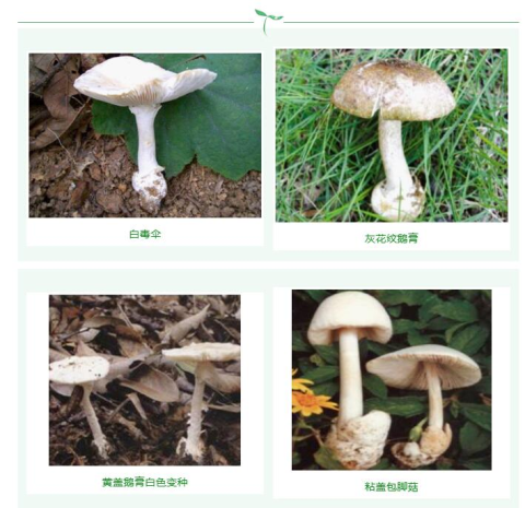 在广东地区,常见剧毒蘑菇种类有白毒伞(致命鹅膏) 、灰花纹鹅膏、黄盖鹅膏白色变种、粘盖包脚菇、簇生沿丝伞(簇生黄韧伞)。