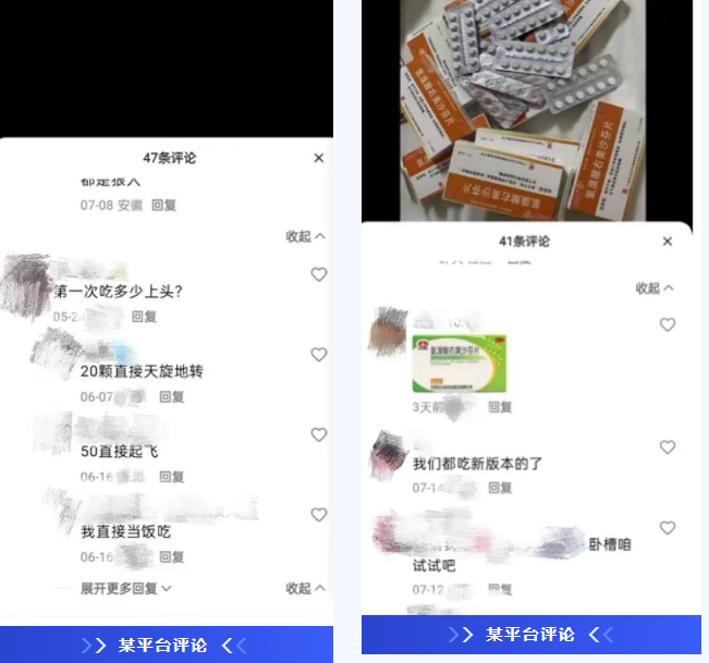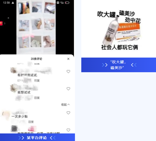 通过对贺某、刘某两人的询问了解,民警使用手机下载某短视频APP,并在APP内搜索右美沙芬片相关视频,立即出现大量关于服用右美沙芬片的视频及图片,视频图片的评论区大多都是自称服用美沙片后获得快感的感受及分享使用方法的文字和图片,也有一些是通过评论内容而跃跃欲试的想尝试人员的评论,更有者把“吹大罐,磕美沙”这种现象作为社会人的标准在网络上传播宣扬,对长期滥用药物产生的种种恶果却无人提及。