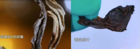 普通的茶叶上会有被称为“茶毫”的白色绒毛。而上图右边的茶叶浸润了冰毒,表面油光锃亮,手感黏腻,遇到这种茶叶,一定要提高警惕!