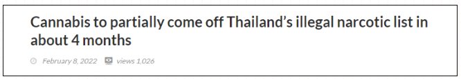 据泰国公共广播服务公司(Thai PBS)报道,泰国卫生部长阿努丁·查恩维拉库尔(Anutin Charnvirakul)2月8日签署政府公告,宣布除了四氢大麻酚(引起神经快感高涨的精神活性物质)高于0.2%的大麻提取物以外,将大麻从泰国第五类毒品名单中剔除,彻底解除大麻与毒品的关系,为家庭种植大麻铺平道路。该变更将在政府公告公布120天后正式生效。