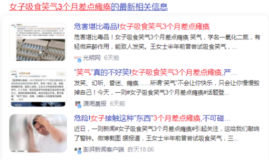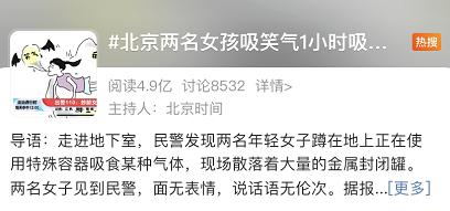 2021年9月,北京两名女孩吸“笑气”1小时吸食200瓶,一度引发热搜,微博话题阅读量高达4.9亿,讨论量达8千多次。