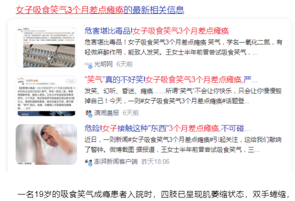 2021年9月,北京两名女孩吸“笑气”1小时吸食200瓶,一度引发热搜,微博话题阅读量高达4.9亿,讨论量达8千多次。