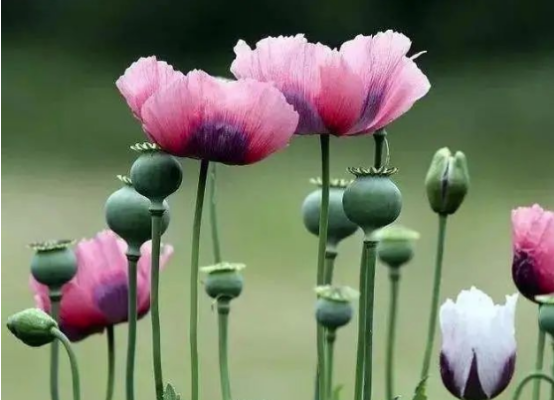 罂粟是一年生草本。叶片碧绿,花朵五彩缤纷,茎株亭亭玉立,蒴果高高在上,夏季开花,花大,单生枝顶。花瓣4片,红色、紫色或白色。果实球形或椭圆形,种子小而多。