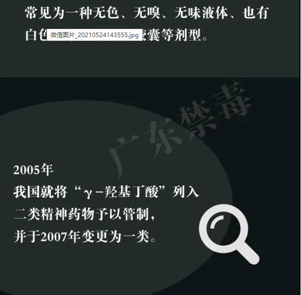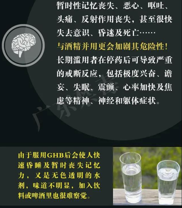 γ-羟基丁酸,英文缩写为“GHB”,又名“听话水”“失忆水”,是一种无色、无嗅、无味的液体,与乙醇等饮料混合后,普通人很难察觉到异常。