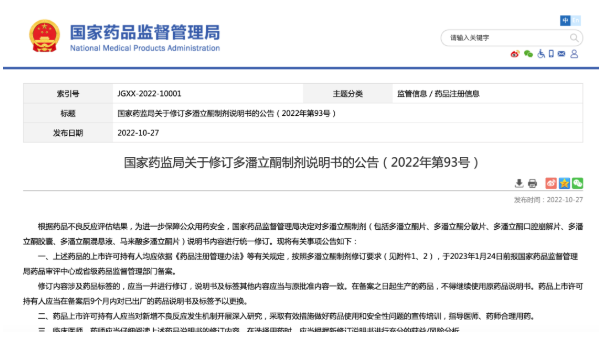 公告称,根据药品不良反应评估结果,为进一步保障公众用药安全,国家药品监督管理局决定对多潘立酮制剂(包括多潘立酮片、多潘立酮分散片、多潘立酮口腔崩解片、多潘立酮胶囊、多潘立酮混悬液、马来酸多潘立酮片)说明书内容进行统一修订。