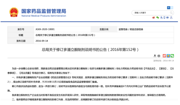 2016年9月,原国家食药监总局发布《关于修订多潘立酮制剂说明书的公告》,对多潘立酮非处方药和处方药的说明书进行了修改。在不良反应中也增加了和心脏疾病相关内容等。