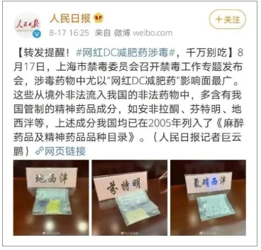 比如泰国DC减肥药等非法减肥药品中,多含有我国管制的精神药品成分,如安非拉酮、芬特明、地西泮、氯硝西泮等。另外,西布曲明、氟西汀等违禁药品成分也常常出现在网红减肥药中。