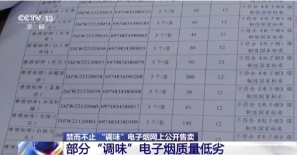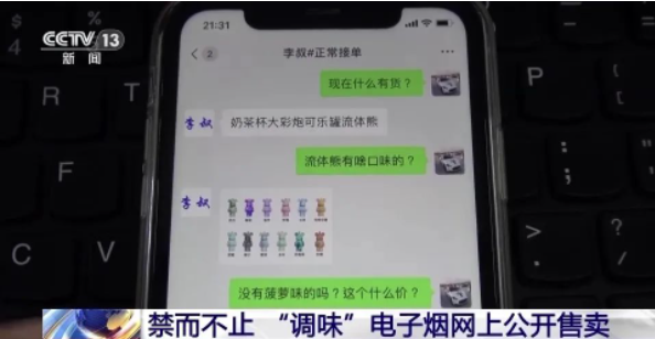 记者调查发现,在一些电商平台上也有商家在公开售卖“调味”电子烟。去年5月1日起施行的《电子烟管理办法》规定:任何个人、法人或者其他组织不得通过本办法规定的电子烟交易管理平台以外的信息网络销售电子烟产品、雾化物和电子烟用烟碱等;禁止销售除烟草口味外的调味电子烟和可自行添加雾化物的电子烟。也就是说,“调味电子烟”是明令禁止销售的。然而,记者在调查中发现,本该被明令禁售的“调味”类电子烟在网络上依然可以轻易买到。
