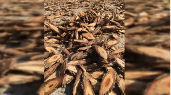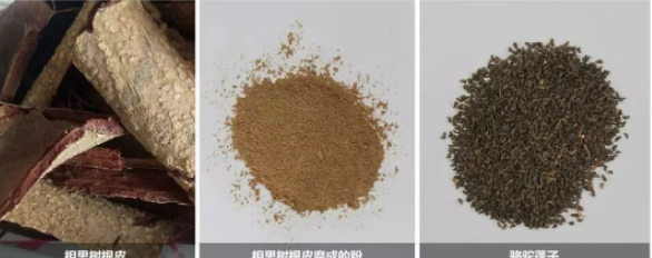 外观特点:金合欢属植物相思树的根皮,内皮呈红褐色,外皮呈灰白色带有白色圆点,干燥粉碎后为褐色粉末。