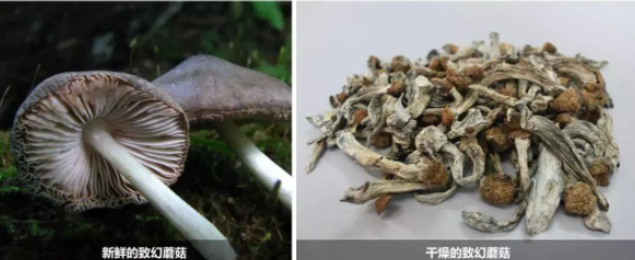 外观特点:这种迷幻蘑菇外观为黄色至褐色的新鲜蘑菇或蘑菇干,具有特殊的臭味。