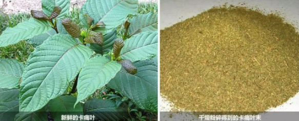 外观特点:茜草科帽蕊木属植物卡痛的叶片,一般干燥粉碎后使用,外观为黄绿色或红棕色植物碎片或粉末。