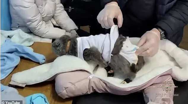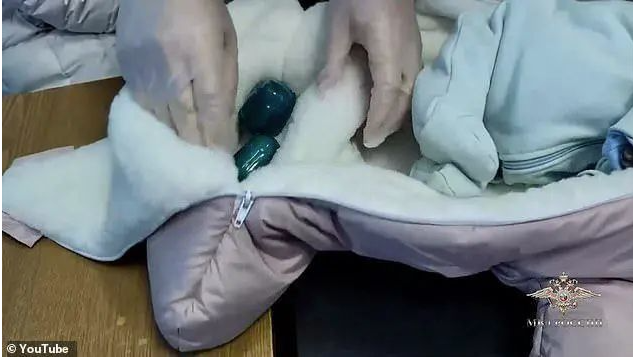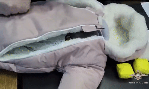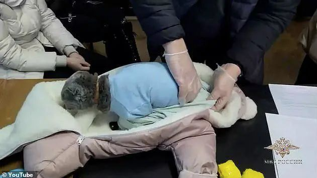 俄罗斯内政部通过媒体发布了警察检查“小婴儿”的古怪视频,可以看到,当警察小心翼翼地拉着连体服的拉链时,先是在帽子中看到有几个黄色的小包裹,似乎是泡沫做的。