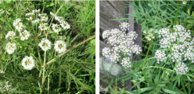 茎上有沟,下有暗红斑点,开白色小花,整棵散发臭味,其有毒成分是毒芹素,全株均有毒,其中根茎最毒,儿童误服10g可致死,对哺乳动物有较强的毒力,国内外常有关于动物食用毒芹中毒的报告。(左图为毒芹,右图为水芹)
