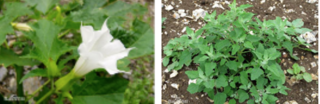 别名大喇叭花,植株较高,约0.5-1.5米,全株均有毒,种子毒性最大。毒性物质为莨菪碱、东莨菪碱和阿托品等。食用和外敷曼陀罗叶均能引起全身性中毒,一般在食用30分钟后出现症状,多为急性突然发病。(左图为曼陀罗,右图为藜)