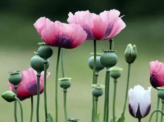 罂粟是一年生草本。叶片碧绿,花朵五彩缤纷,茎株亭亭玉立,蒴果高高在上,夏季开花,花大,单生枝顶。花瓣4片,红色、紫色或白色。果实球形或椭圆形,种子小而多。