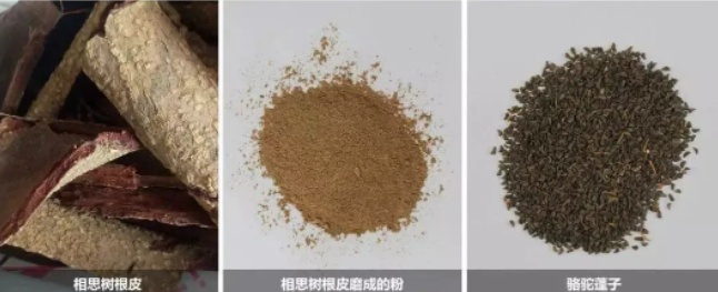 外观特点:金合欢属植物相思树的根皮,内皮呈红褐色,外皮呈灰白色带有白色圆点,干燥粉碎后为褐色粉末。