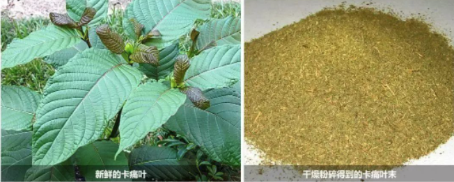 外观特点:茜草科帽蕊木属植物卡痛的叶片,一般干燥粉碎后使用,外观为黄绿色或红棕色植物碎片或粉末。