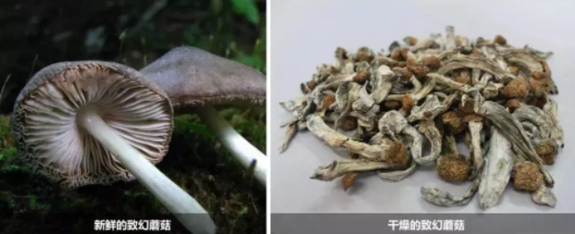 外观特点:这种迷幻蘑菇外观为黄色至褐色的新鲜蘑菇或蘑菇干,具有特殊的臭味。