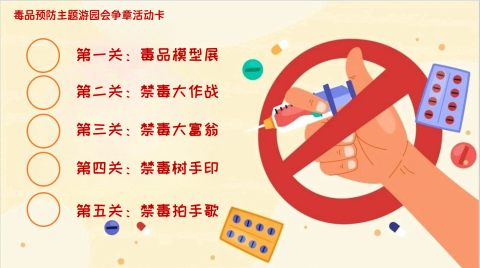 此次毒品预防教育主题游园会从认识毒品的种类、了解毒品的危害、学会拒毒的方法、抵制毒品的决心以及宣传禁毒的行动等维度展开,由本校高年级学生带领中低年级学生开展五个板块的活动,分别是“毒品模型展”“禁毒大作战”“禁毒大富翁”“禁毒手印树”和“禁毒拍手歌”,环环相扣,层层深入。