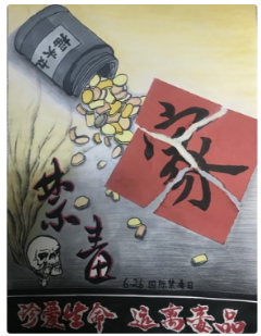 2. 选一选:展示小组搜集或绘制的禁毒宣传画 ( 如下图 ),小组派代表介绍推荐理由,同学们选出心目中的最优作品。