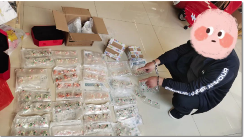 同年10月,民警获取“嫌疑人购买了一批含毒品‘减肥药’正准备给下线寄出”线索,立即收网抓捕,将袁某夫妻二人抓获归案,当场查获含毒品成分“减肥药”792包,共计5000余粒。通过深挖细查,循线追击,民警又将袁某的上线刘某和多名下线悉数抓获,在吉林省某地刘某家中,查扣含毒品成分“减肥药”1080包,共计4260余粒。