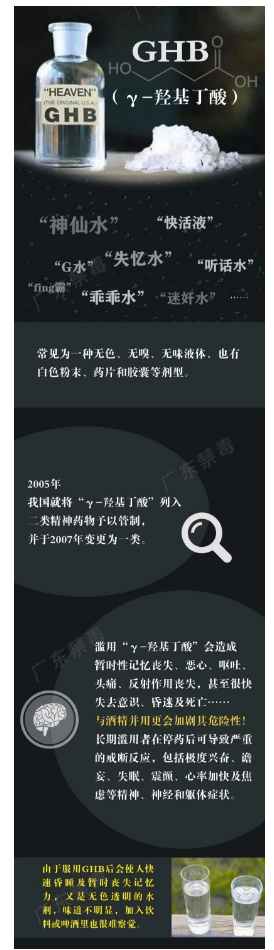 经过实验室化验,发现案中这个形似眼药水的东西,其实含有“γ-羟基丁酸”。“γ-羟基丁酸”是我国麻醉药品和精神药品品种目录列管的一种药品,滥用会造成暂时性记忆丧失、恶心、呕吐、头痛、反射作用丧失,甚至很快失去意识、昏迷及死亡。
