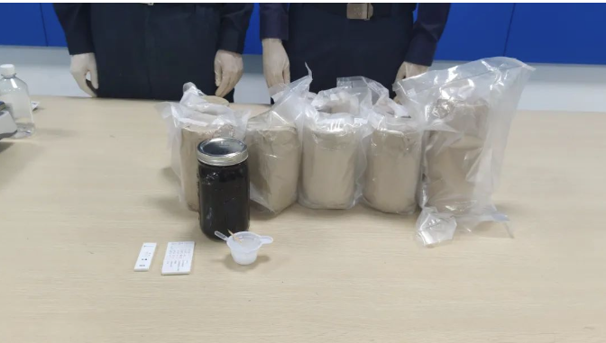 日前,深圳邮局海关关员在对转运货物开展监管时发现,一票申报为“添加剂”的包裹机检图像可疑,随即对其开箱查验。经查发现,该票包裹内有用气泡膜和油纸包裹的玻璃瓶10瓶,内有黄色油状膏体,重15825.9克。经试剂检测,上述膏体呈大麻阳性反应。