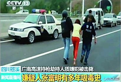 根据苍溪县警方通报,经初步查明,犯罪嫌疑人名叫张富明,男,47岁,重庆市沙坪坝区人,有多年吸毒史。13日驾车行至广南高速天宫院出口附近,因毒瘾发作,下车向车辆和行人开枪射击,然后开车向苍溪方向行进,行驶至广南高速苍溪段园山子大桥时毒瘾再次发作,向周围的行人、车辆射击,当警方赶到时便劫持同车女性为人质,并向民警射击。