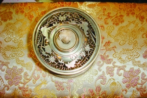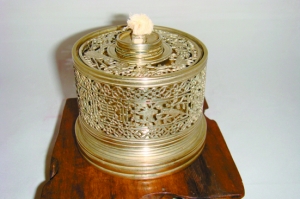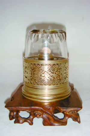 该灯不仅结构复杂,而且组合多样:由灯罩、灯座、灯座外套和灯座盖板4个部分组成;高度共计12厘米,其中灯座高6.8厘米,灯罩高5.2厘米(为车料玻璃),直径为8.2厘米(图1)。颇有中国传统文化意味的是雕刻于整个鸦片灯周身的各种花纹:首先是灯座盖板上的牡丹、蝴蝶花纹,显然其寓意为 “富贵无敌”(图2);另外,灯座外圈则镂空雕有喜鹊、梅花和寿字,可见是传统寓意中的“喜上眉梢,幸福长寿”(图3)。毫无疑问,该鸦片灯的最初所有者非富则贵。