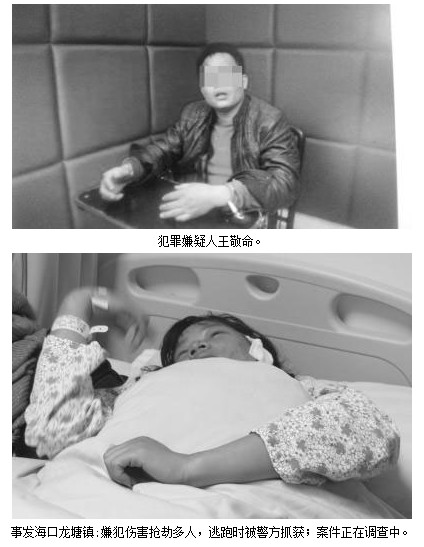 据海南特区报报道 1月31日(大年初一)上午,海南省海口龙塘镇三桥村委会玉场村一名男子,吸食毒品后举止异常,殴打妻子并摔死仅5个月大的亲生女儿,接着又咬伤、打伤、砍伤、抢劫多名群众。接到报警后,海口市公安局琼山分局和龙华分局民警及时布控,将疯狂伤害、抢劫数人的犯罪嫌疑人抓获,缴获被抢劫的钱物和作案工具。目前,犯罪嫌疑人已被海口警方刑事拘留,案件在进一步调查中。 春节是万家团圆、祥和喜庆的日子。可大年初一上午,海口龙塘镇三桥村委会玉场村村民王敬命,突然间行为失常,变得像疯子一般。 据玉场村的村民介绍,王敬命平时和妻儿在海口租房住,过年才回家。大年初一上午9时30分左右,王敬命突然跑到一村民家的二楼楼顶,然后从楼上跳了下来。王敬命的母亲和妻子扶他回家,他大吼大叫,像疯了似的用手卡住妻子的脖子并殴打妻子。妻子反抗和指责他,他竟然跑回家里,抱起仅5个月大的亲生女儿,残忍地摔在地上。 听见打闹声和孩子的啼哭声,住在隔壁的王敬命表嫂出来劝他。六亲不认的王敬命好像一条疯狗,咬伤表嫂的大腿后,一溜烟地跑进了村里继续作恶。 他恶狼般抱着一名妇女乱咬 龙塘糖厂位于玉场村。36岁的尹女士是龙塘糖厂的临时工。1月31日上午8时左右,尹女士起床后曾看见王敬命从她家门口经过。上午10时左右,尹女士在自己住的房间听到旁边房间内传来打砸物品的声音。随即,尹女士打开自己房门出来看时,王敬命就从她小孩的房间内向她扑了过来。尹女士说,当时王敬命眼睛通红,好像一匹恶狼般地拉住她的手,将她紧紧抱着,对她一通乱咬。将她的左耳、两侧手臂、两个手掌咬伤。 尹女士在家门口拼命想推开王敬命,但是感觉他力大无比。就在她惊恐万分时,村里一名路过的男子见状,向王敬命大吼了一声。王敬命一惊,松开了尹女士,随后躺倒在地上。 尹女士惊慌失措地跑开。她看到自己的两个孩子从外面走回家,怕孩子们受到伤害,急忙让孩子们躲避起来。 随后,尹女士来到龙塘镇卫生院接受治疗。尹女士在卫生院碰到了被王敬命砍伤的妇女薛小连。薛小连一侧腋下被砍了一刀。后来120救护车把尹女士等伤者送到海口市人民医院接受治疗。尹女士被咬伤的左耳缝了10多针,两侧手臂和手掌也被咬伤。 尹女士向记者说起当时的情景仍心有余悸:“我的力气不小,但当时觉得他的力气更大,我怎么推都推不开他。幸好当时我的小孩不在家,否则后果不堪设想。” 多名群众遭到伤害和抢劫 尹女士说,她与王敬命是同一个村的,双方平时无冤无仇。尹女士告诉记者,她被王敬命咬伤后,跑出来时遇到王敬命的哥哥,才得知王敬命在此之前把自己的小女儿摔了。 王敬命倒在地上后不久,自己爬了起来,他把身上的衣服和裤子脱掉,一丝不挂地跑进龙塘糖厂职工徐日星的宿舍,将徐日星的木门、电脑等物品打坏,打伤徐日星头部,并抢走宿舍里两部手机等物品,接着匆匆逃离了现场。随后,王敬命跑进龙塘糖厂一职工的宿舍,穿走了一名男职工的衣服。 王敬命手持一把长长的砍刀,来到龙塘糖厂门口附近路段。龙塘镇椰子头村村民符方钟骑着一辆摩托车(牌号为琼AH6963)载着老婆孩子,一家三口经过龙塘糖厂路段时,遭王敬命持刀拦路抢劫。王敬命将符方钟的老婆薛小连腰部砍伤,抢走他们的手机、钱和摩托车,随后骑着摩托车逃离现场。 接着,王敬命持刀砍破一辆宝马小轿车的前挡风玻璃,然后到龙塘镇三桥村委会路段抢劫一名男子的一枚金戒指、一部手机,骑着抢来的摩托车往海口龙泉镇方向逃跑。 多名民警联手将嫌疑人抓获 1月31日上午11时许,海口龙塘派出所接到群众报警。随后,龙塘派出所所长丁厚尧带领民警立刻出警赶往案发现场。在现场了解到受害人符方钟一家三口骑着一辆摩托车经过龙塘糖厂路段时,被一名男子持刀拦路抢劫并将其老婆砍伤,抢走他们的手机、钱和摩托车。 根据受害人提供的犯罪嫌疑人的特征和逃跑方向,龙塘派出所民警一边联系龙泉派出所一边往龙泉镇方向追赶。在龙塘休假的海口市公安局琼山分局飞鹰大队队员庄多良、梁定康、韦长第、杜乾海,得知情况后也驾车和龙塘派出所民警一起追赶。民警们追赶至龙泉镇东占村委会新村时,犯罪嫌疑人弃车逃进村里。 13时20分左右,龙泉派出所接到海口市公安局龙华分局指挥室指令:在龙泉镇东占村委会新村处有一男子持刀要伤人,迅速派员前往抓捕。 龙泉派出所所长刘华革带领值班民警赶到现场时,王敬命跑到新村一农户家厨房,拿出两把菜刀企图行凶,几名村民将他手里两把菜刀夺了下来。 海口龙泉派出所5名警员将嫌疑人王敬命控制后,王敬命还奋力反抗, 在赶来的龙泉派出所民警和村民的协助下,终于将犯罪嫌疑人抓获。 6日,参与抓捕嫌疑人王敬命的龙泉派出所民警云大辉告诉记者:“嫌疑人王敬命个子高,力气大,我们5名警员合力才将他拖上了警车。” 警方抓获王敬命后,当场缴获4部手机、人民币568.4元、车牌号为琼AH6963的二轮摩托车一辆。经审讯,王敬命交待在案发前曾吸食了冰毒。 龙泉派出所民警通过手机联系上符方钟。得知自己被人抢走的摩托车已被警方追回,符方钟感激万分。龙泉派出所民警随后将王敬命移交给龙塘派出所处理。 5个月大女儿被父亲摔亡 龙塘派出所所长丁厚尧告诉记者,案发当天是大雾天气,能见度在10米