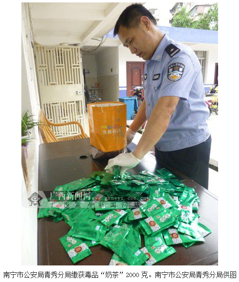广西新闻网南宁4月21日讯(通讯员唐雅岚 记者潘晓明)4月20日晚11时许,南宁市公安局青秀分局禁毒大队在南宁市武鸣县府城收费站破获一起贩毒案,缴获新型毒品“奶茶”2000克,抓获尹某珊、尹某平两名犯罪嫌疑人。