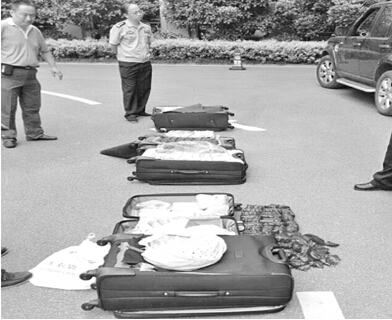 随后,民警在该酒店客房里抓获“香港老板”刁某。民警从其身上搜出一把路虎车钥匙,在酒店停车场的一辆深蓝色路虎车后备箱内,又发现4个同规格的大行李箱,从箱子的夹层里又查获毒品麻果40公斤。