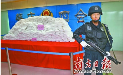 肇庆、四会警方近日在四会市捣毁了一个制毒工场,该案是肇庆迄今为止最大的一宗制贩毒品案件。图中白袋物品为警方缴获的731公斤冰毒成品。南方日报记者 郭智军 摄