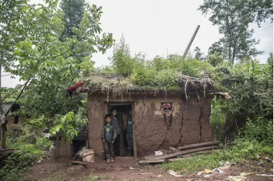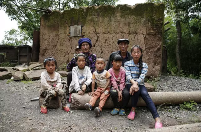 66岁的伍散一家在破败的家前。现在他家中只剩下老伴,以及六个孙儿。这六个孙儿是伍散三个儿子的遗孤。他的三个儿子都吸毒,相继病发身亡。家中光景败落,他们身后原本是他们的房子,但如今只剩断壁残垣。现在他们一家寄住在外出打工的侄子家。