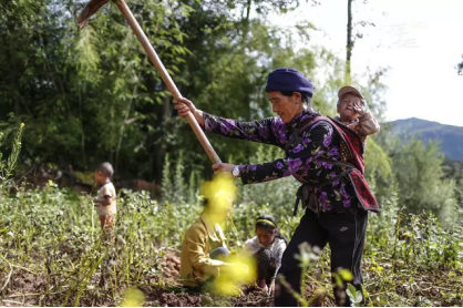 60岁的阿古奶奶背着最小的孙子在地里挖土豆。小孙子粘奶奶,奶奶一放下他,他就哭,奶奶只好背着他挖土豆。时值夏季,正是土豆的收获季节。孙儿们全部都过来帮奶奶。