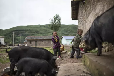 曲尔的两个弟弟在赶家中的三头猪进屋,他俩还没有上学。姐姐上学的时候他们就自己照顾自己。
