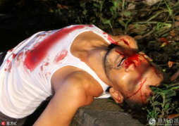 据报道,事件发生地在菲律宾首都马尼拉,该男子据说是一名毒贩,被警察枪击致死,警察还在其头部紧紧地裹上了黄色的强力胶带。图为男子头裹胶带躺在地上。