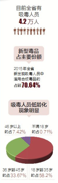 海南公安机关透露,在全省在册的吸毒人员中,不满18岁的占0.71%;18岁到35岁的占58.2%;36岁到45岁的占33.67%;46岁以上的占7.42%,吸毒人员以青壮年为主,低龄化现象明显。