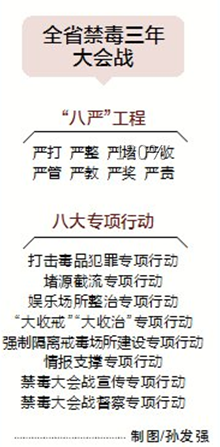 从今年开始,全省实施青少年毒品预防教育“6·27”工程,启动禁毒三年大会战,开展八大专项行动