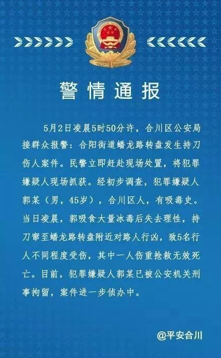 经初步调查,犯罪嫌疑人郭某(男,45岁),合川区人,有吸毒史。当日凌晨,郭某吸食大量冰毒后失去理性,持刀窜至蟠龙路转盘附近对路人行凶,致5名行人不同程度受伤,其中一人伤重抢救无效死亡。目前,犯罪嫌疑人郭某已被公安机关刑事拘留,案件进一步侦办中。