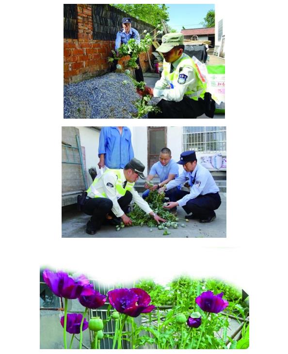 图为5月22日下午,娄塘所社区民警与村干部、人口协管员、治安联勤在辖区巡逻时,发现一农户院前院后种有罂粟,当场对该村民进行禁毒法律宣传并进行了铲除