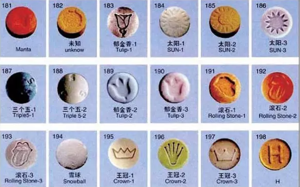 常见形态:摇头丸多为片剂,五颜六色。K粉是无色无味的白色结晶粉末,易溶于水。