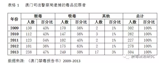 澳门司法警察局的刑事调查厅设有毒品罪案调查处,专门处理与贩卖麻醉品及精神类药物有关的犯罪。因此,经司法警察局处理过的非法药物相关犯罪,形成了澳门毒品犯罪情况报告,涉及了贩卖、滥用或其他与非法药物相关的犯罪,与美国联邦调查局提供的全美《犯罪统一报告》有异曲同工之效,它可以帮助我们对澳门毒品的情况有一个整体的了解。从2009年至2013年,司法警察局接收的涉毒案件总数分别是767件,812件,927件,957件和1152件,整体呈上升趋势。